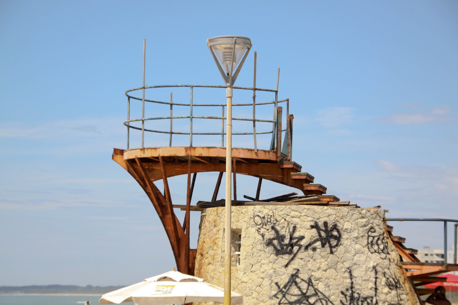 Pouco à vontade e até receoso pela minha segurança, escalei um posto de observação de bombeiro salva-vidas que, ajulgar pelo abandono e estado lastimoso da estrutura metálica, estaria com toda a certeza fora de uso. Engano meu, porque imediatamente surgiu do nada um musculoso garotão envergando sua camiseta rubra-de-fogo que, com voz de trovão,bradou: “Ó camarada! Desça já daí!”. Obedeci e desfiz-me em desculpas, enquanto explicava as minhas errôneas suposições. O rapaz reduziu ovolume e, enquanto me autorizava a subir para fazer as minhas fotos, confidenciou-me sua lástima pelo miserável estado da sua infraestrutura de trabalho, coisa intolerável na”Cidade-Capital-do-Petróleo”!