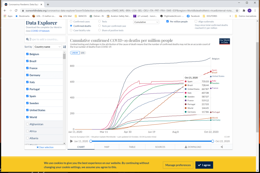 Imaginei então que essa seria uma europa – país em que seus 6 membros seriam estados como os brasileiros; Cada estado tem sua contagem cuja soma dá os tais 731.1 óbitos por milhão. Se pudéssemos fazer uma conta de resultados lineares, considerando o número maior de habitantes dos países europeus incluídos, o Brasil estaria contando 971.2 óbitos por milhão de habitantes, onde o somatório da europa é de 3.107.9 por milhão do somatório geral dos seus habitantes. Vai ver que estou sendo simplório…